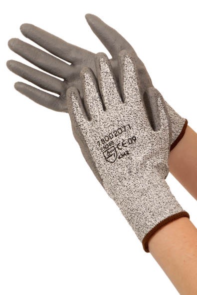 Handschoen van PU coating op een 100% dynema rondgebreide drager.
